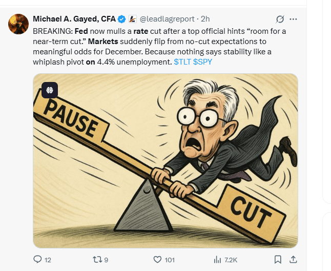 Markets swung as the implied odds of a cut dropped sharply during the week and then jumped again after Williams’ remarks, reminding you that shifts in rate expectations can quickly move growth stocks, bank shares, and the dollar.