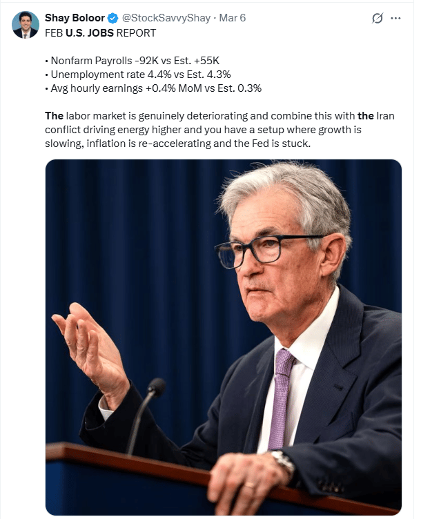 The February U.S. jobs report showed a loss of about 90,000 jobs.