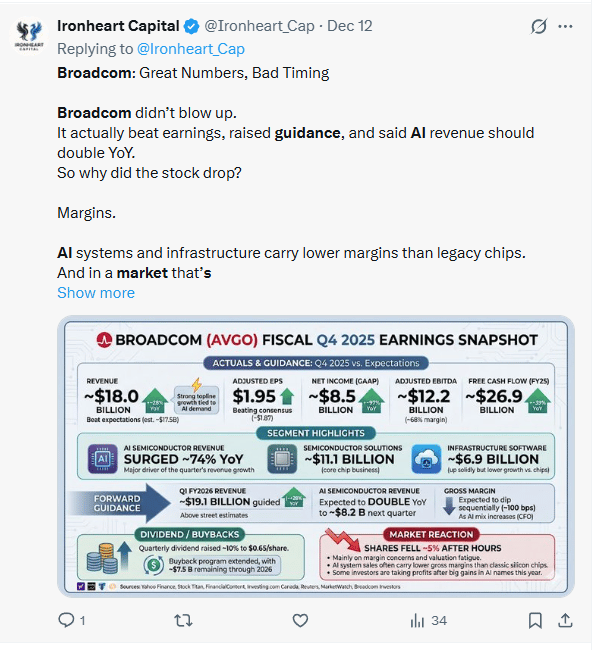AI and chip names took a hit after Broadcom’s huge one-day market cap wipe-out and cautious guidance made investors question how fast AI revenues will ramp.